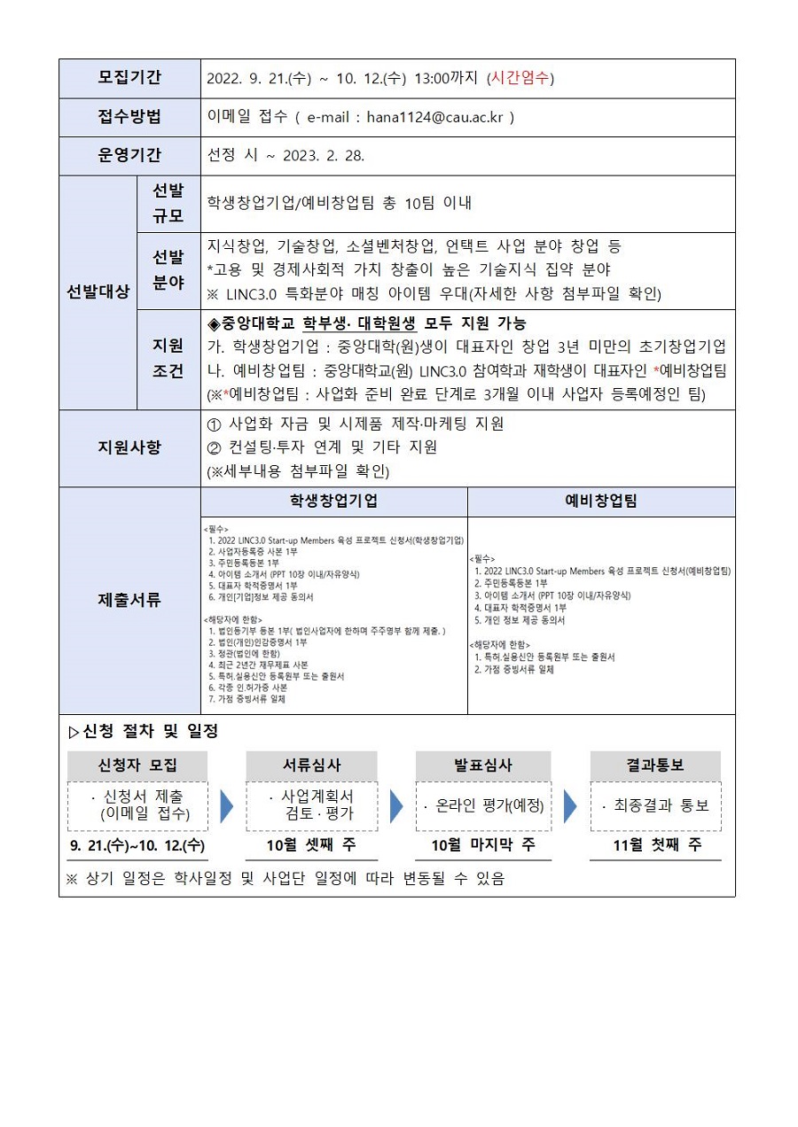 대학의 창업 인프라(인력, 장비 등)를 활용하여 학생창업자의 창업 성공률을 제고하고 교내 기업가 정신을 확산하고자 『2022 LINC 3.0 Start-up Members 학생창업팀 육성 프로젝트』를 운영하오니 많은 관심과 참여 바랍니다. (▷문의처 : LINC3.0 사업단 02)820-6849/ hana1124@cau.ac.kr) ![]() |