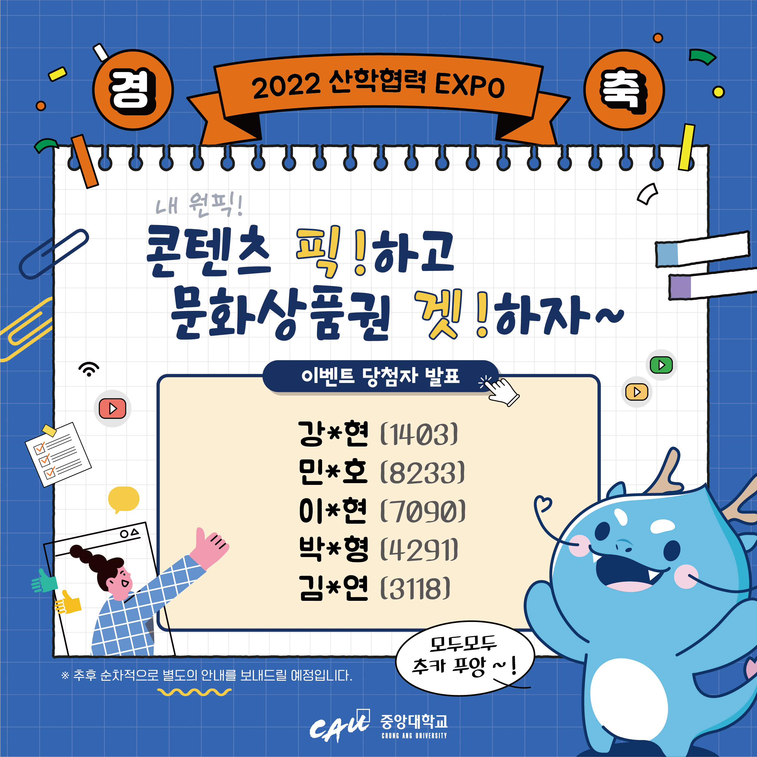 ♥ 2022 산학협력 EXPO 중앙대학교 부스이벤트 당첨자발표 ♥ 우선 이벤트에 참여해주신 모든 분들께 감사의 인사를 드리며, 다음과 같이 당첨자(5인) 발표를 공지해드립니다. 감사합니다. ※ 추후 별도의 안내(이메일)를 보내드릴 예정입니다. |