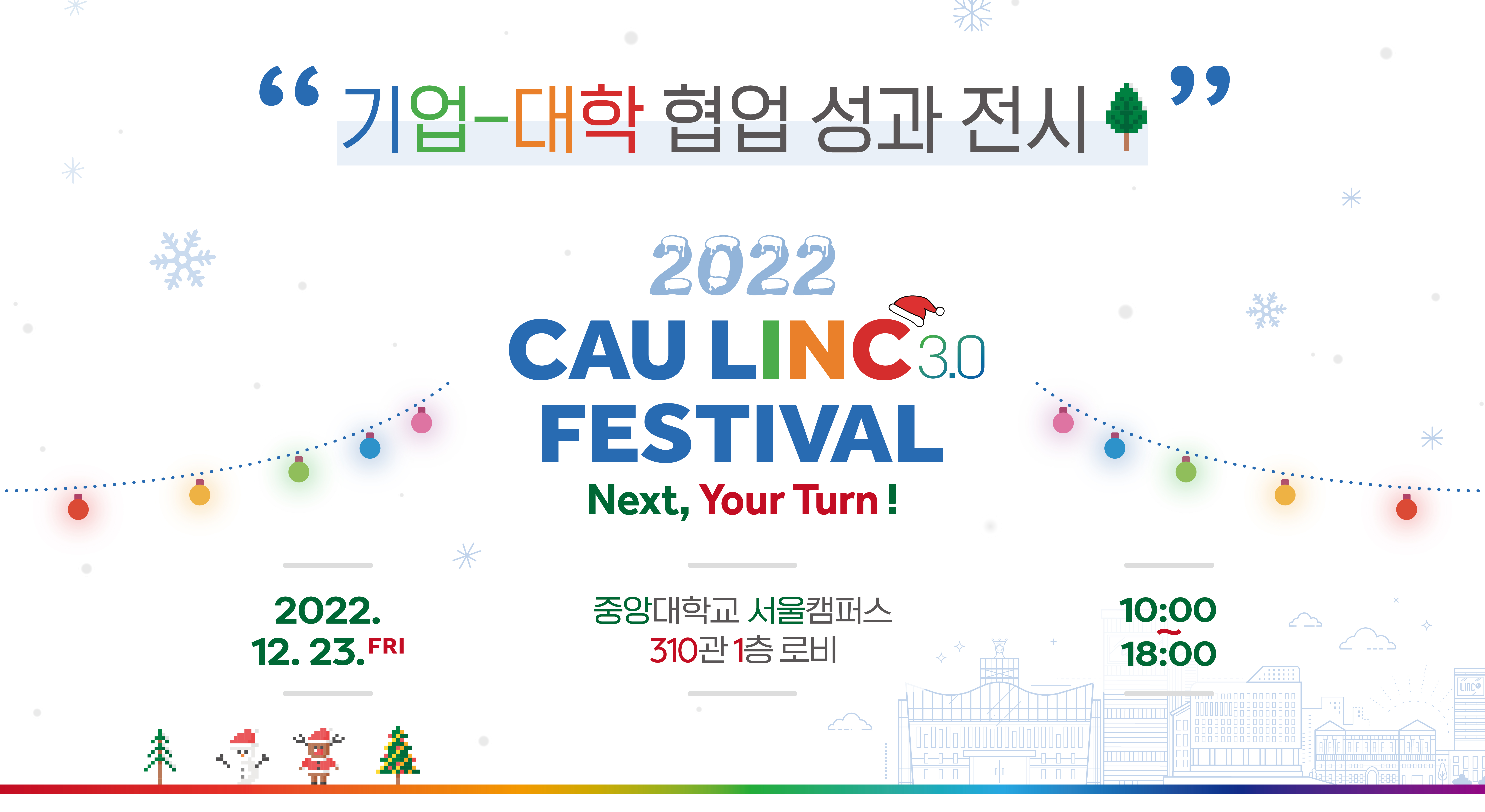 『2022 LINC 3.0 FESTIVAL 개최』 ● 행사명 : 2022 CAU LINC 3.0 FESTIVAL - Next, Your Turn! ● 행사기간 : (온라인)2022. 12. 21.(수) ~ 2022. 12. 23.(금), 3일간 (오프라인)2022. 12. 23(금) 10시 ~ 18시 ● 행사장소 : 중앙대학교 서울캠퍼스 310관(100주년 기념관) 1층 로비 일대 ● 주요내용 : 개막식, 산학협력 SUMMIT, 산학협력 Awards 및 성과 전시, ICC 성과 전시, 지역사회 문제해결 프로그램 성과 전시, Start-up Members 플리 마켓, 문화예술 체험활동(학교기업'아리' 국악악기체험, 향수만들기, 머 그컵만들기, 열쇠고리&컬러링만들기, 북바인더만들기) 12/23(금) 310관 1층 로비로 많은 관심과 발걸음 부탁드립니다! ※ 행사관계로 12월 23일(금) LINC 3.0 사업단 담당자들과의 통화 연결이 어려울 수 있으므로 급하신 용무는 해당 담당자분의 메일로 연락주시거나 02-820-6839로 전화주시면 담당자분께 내용 전달 도와드리겠습니다. |