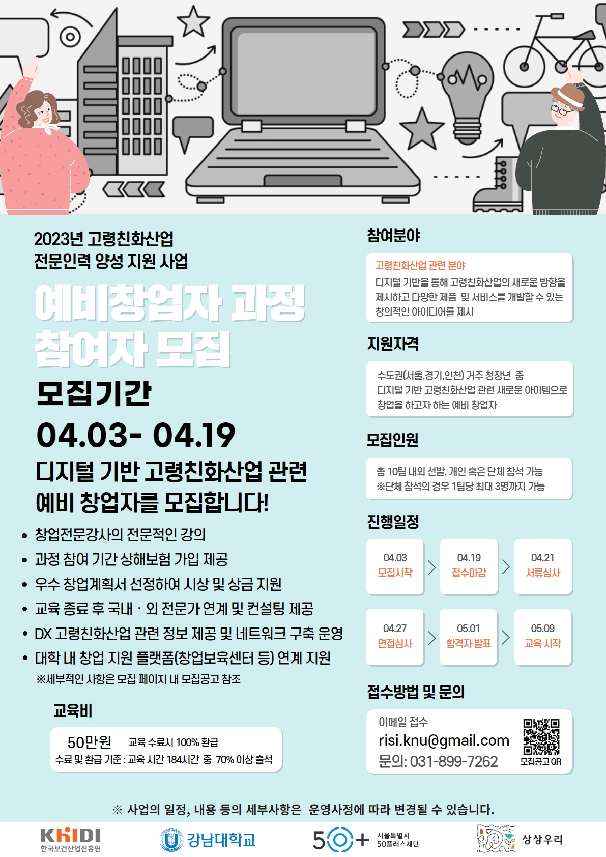 [ 2023년 예비 창업자 대상 고령친화산업 전문인력 양성 지원(3기) ] ▶ 기간 : [모집] 2023년 4월 3일(월) ~ 4월 19일(수) [교육 및 멘토링] 2023년 5월 9일(화) ~ 7월 14일(금) / 총 184시간 ▶ 장소 : 서울시50플러스재단 중부캠퍼스(서울특별시 마포구 백범로 31길 21) ▶ 대상 : 디지털전환 고령친화산업 분야에서 창업을 준비하는 수도권 거주 청장년 ▶ 선발인원 : 10팀(개인 혹은 팀 단위 참석 가능) / 1팀 당 최대 3명 가능, 세대융합 참여 가능 ▶ 비용 : 50만원(전체 프로그램 70%이상 출석 시 100% 환급) ※ 자세한 사항은 첨부된 양식들을 참고해 주세요. |