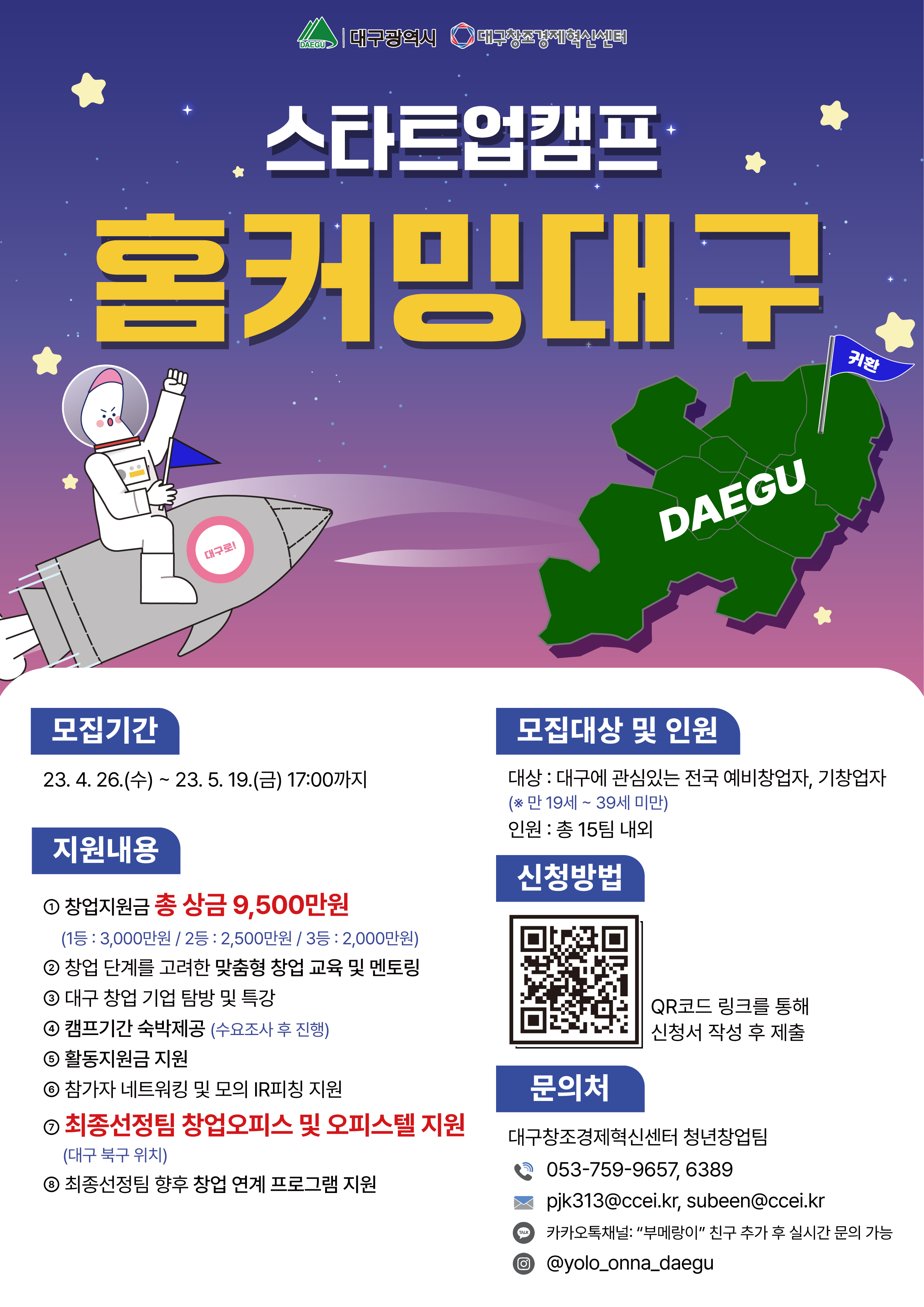< 「청년 귀환 채널구축 사업」스타트업캠프 홈커밍대구 참가자 모집 > ■ 목적 : 타지역의 청년창업가들이 대구에서 창업의 꿈을 실현할 수 있도록 지원 ■ 기간 : [모집] 2023년 4월 26일(수) ~ 5월 19일(금) [운영] 2023년 6월 5일(월) ~ 6월 16일(금) ■ 대상 : 만 19세 ~ 39세의 타지역에서 활동하는 청년창업가 ■ 내용 : 1) 창업 단계를 고려한 맞춤형 창업교육 및 멘토링 / 창업 기업 탐방 및 특강 2) 캠프 기간 숙박제공 / 활동지원금 지원 3) 참가자 네트워킹 및 모의 IR 피칭 지원 4) 최종 아이디어 공유회 ■ 최종 선발 팀(3팀) 지원내용 1. 사업화자금 총 9,500만원(1등 : 3,000만원 / 2등 : 2,500만원 / 3등 : 2,000만원) 2. 창업공간(대구 북구 소재 대구은행 제2본점 대구창업캠퍼스) 3. 주거공간(대구 북구 소재 오피스텔) 4. 창업 지원 프로그램 연계 |