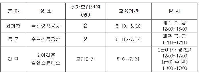▶「2023. 관악 청년공방」1기 교육생 추가모집 ◀ ?관악구 공방에서 실무 중심의 기술교육 및 창업 컨설팅을 통해 예비 창업청년을 양성하고자,「2023. 관악 청년공방」을 운영합니다. 1. 모집기간 : 2023년 5월 8일(월) 18:00까지 2. 모집대상 : 만 19 ~ 39세 서울시 거주 예비 창업 청년 ※ 신청대상보다 많은 인원이 모집될 경우, 미취업 및 창업희망 관악구민 우선 선발 3. 교육내용 : 분야별 기술교육 및 창업컨설팅 4. 분야별 교육기간 및 추가 모집 인원 ?5. 신청방법 : 첨부파일의 신청서 작성 후 이메일 제출(hyunji7213@ga.go.kr) ※ 관악구청 홈페이지 → 뉴스소식 → 관악소식에서도 확인 가능 6. 교육비 : 무료 (※ 재료비 등 자부담) 7. 기타 : 선발 여부는 5월 9일 개별 안내 예정 8. 문의 : 관악구 청년정책과 (☎ 02) 879-5931) |