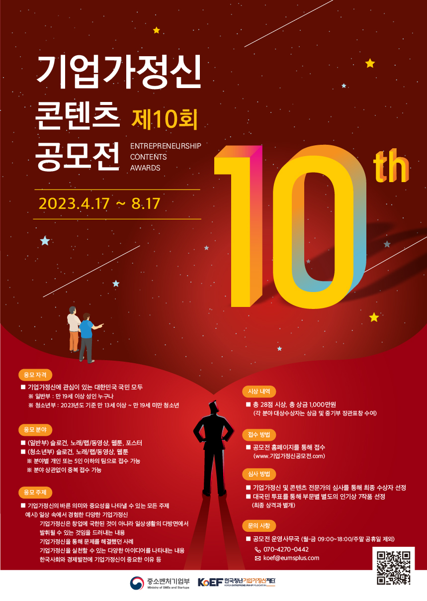 (재)한국청년기업가정신재단은 전 국민을 대상으로 올바른 기업가정신 인식 제고와 인지도 향상을 위해 「제10회 기업가정신 콘텐츠 공모전」 을 아래와 같이 진행합니다. 국민 여러분의 많은 관심과 참여를 부탁 드립니다. □ 공 모 명: 제10회 기업가정신 콘텐츠 공모전 □ 공모주제: 기업가정신의 바른 의미와 중요성을 나타낼 수 있는 모든 주제 ▶ 일상 속에서 경험한 다양한 기업가정신 ▶ 기업가정신은 창업에 국한된 것이 아니라 일상생활의 다방면에서 발휘될 수 있는 것임을 드러내는 내용 ▶ 기업가정신을 통해 문제를 해결했던 사례 ▶ 기업가정신을 실천할 수 있는 다양한 아이디어를 나타내는 내용 ▶ 한국사회와 경제발전에 기업가정신이 중요한 이유 등 □ 참가자격: 기업가정신에 관심이 있는 성인 및 청소년(성인은 2023년도 기준 만 19세 이상, 청소년은 만 13세 이상에서 19세 미만인 자) □ 주요일정 ▶ (접수기간) 2023.4.17.(월) ~ 8.17.(목), 17시 ▶ (수상자 발표) 2023. 9월 말 예정 ▶ (시상식 일정) 2023. 11월 셋째 주 예정, 추후 안내 예정 □ (공모분야) ▶ 일반부 : 슬로건, 노래/랩/동영상, 웹툰, 포스터 ▶ 청소년부 : 슬로건, 노래/랩/동영상, 웹툰 □ (참가방법) 공모전 홈페이지 접수 (www.기업가정신공모전.com) □ (심사방법) ▶ 점수합산을 통해 상위 득점자순으로 수상자 선정 ▶ 위원구성 : 기업가정신, 콘텐츠 분야 전문가로 구성 ▶ 심사기준 : 적합성, 심미성, 작품성, 독창성, 완성도 등 종합평가 □ 시상내역 ▶ (상 금) 총 상금 일천만원정(?10,000,000-) ▶ (시상규모) 중소벤처기업부 장관상 7점, 재단 이사장상 21점, 총 28작품 시상 자세한 내용은 첨부파일 확인 부탁드립니다. |